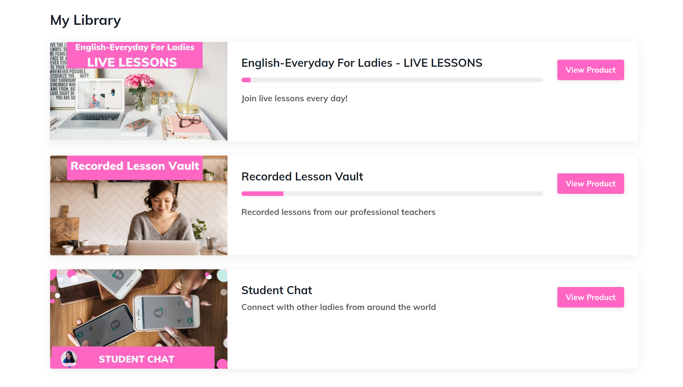 My Library is where you can find the various courses that you have joined. The English-Everyday for Ladies program consists of English-Everyday for Ladies Live Lessons, Recorded Lesson Vault, and Student Chat. Click "View Course" to view the section.
